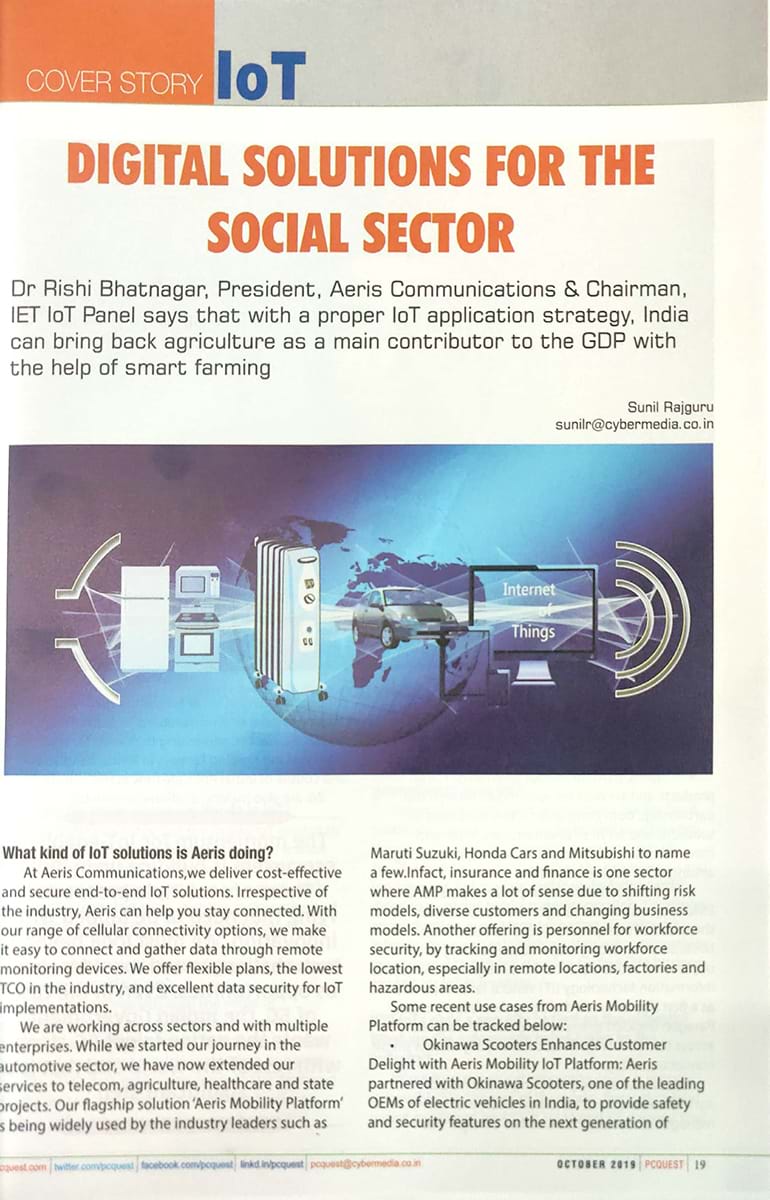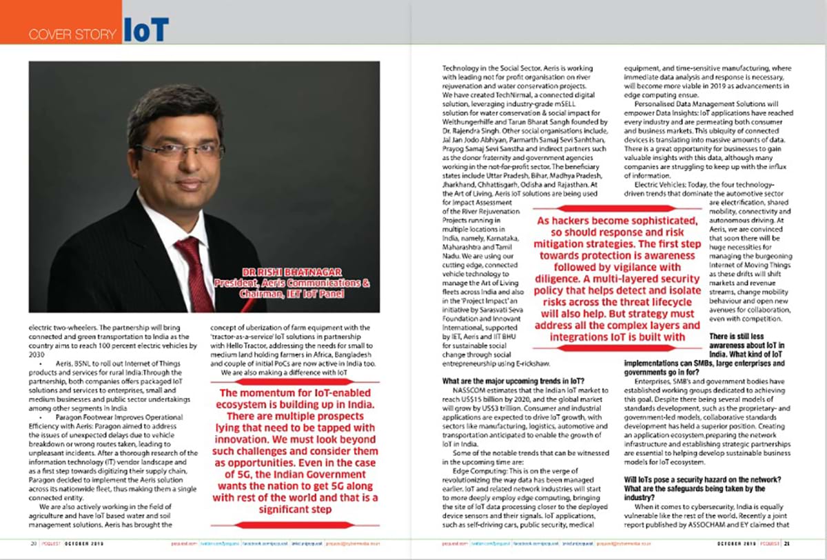 Dr Rishi’s email interaction with PC Quest was published by the magazine in their October Magazine. The magazine had published a 3-page cover story featuring Dr. Rishi’s thoughts in the Indian IoT industry. It also highlighted the suggestions that need to be implemented for an easy deployment of IoT technology in India.