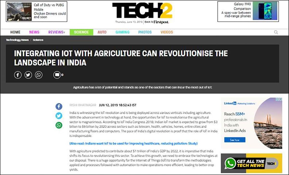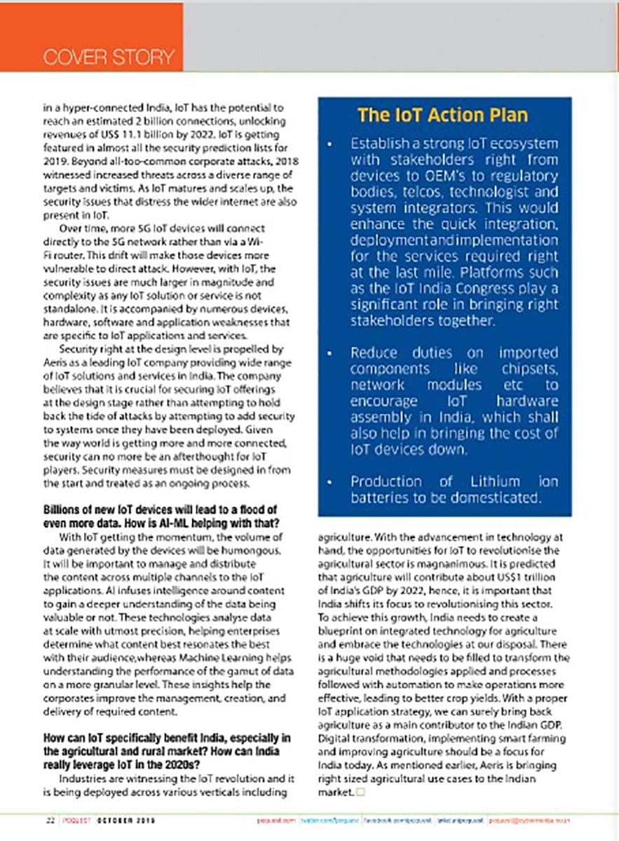 Dr Rishi’s email interaction with PC Quest was published by the magazine in their October Magazine. The magazine had published a 3-page cover story featuring Dr. Rishi’s thoughts in the Indian IoT industry. It also highlighted the suggestions that need to be implemented for an easy deployment of IoT technology in India.